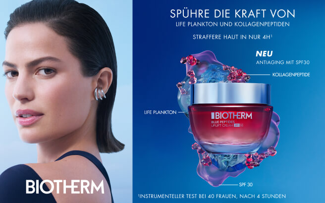 Entdecke das Geheimnis einer sichtbar strafferen Haut und eines strahlenden, gesunden Aussehens mit der Blue Peptides Uplift Day Cream von Biotherm - eine Creme der neuen Blue Peptides-Reihe. Die Formulierung basiert auf modernsten biowissenschaftlichen Erkenntnissen und kombiniert Life Plankton mit Kollagenpeptiden, um die Kollagensynthese zu stimulieren. Der erhöhte Kollagengehalt gibt der Haut die strukturelle Unterstützung, die sie braucht, um straffer auszusehen. Die Blue Peptides Uplift Cream sorgt für ein rosiges Hautbild und einen strahlenden Glow.