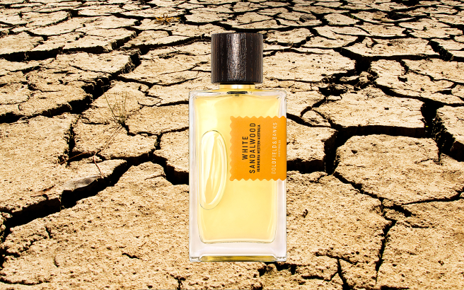 White Sandalwood erinnert an das wohl duftende Öl, das die balsamischen Blätter eines heiligen Baums herab fließt, während die trockene Erde unter dem kobaltblauem Himmel in feurigem Gelb leuchtet.