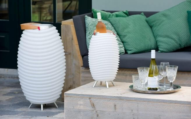 Die Boden-LED-Lampe Synergy mit Bluetooth-Lautsprecher und Weinkühler, dient als Lampe und Wiedergabegerät zum Musik-Streaming. Der Behälter oben kann zum Kühlen von Getränken oder als Blumentopf benutz werden.