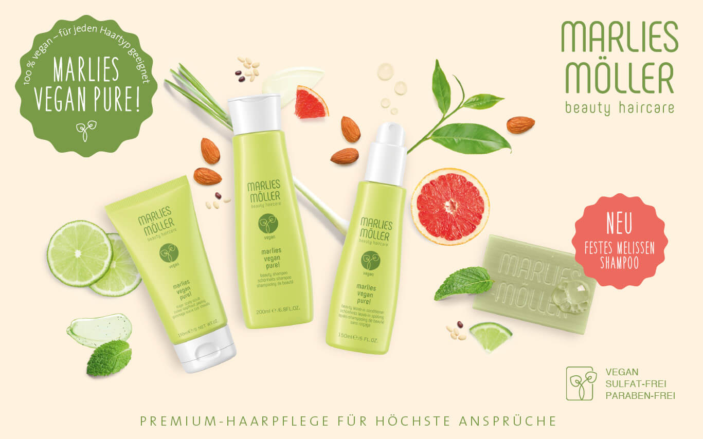 Marlies Vegan Pure! – die neue Pflegeserie von Marlies Möller beauty haircare verwöhnt die Haare mit luxuriösen & veganen Wirkstoffen. Mehr Feuchtigkeit, tolles Volumen und gesunder Glanz dank natürlicher Power-Inhaltsstoffe - für einen veganen Lebensstil mit gewohnten Luxus-Verwöhn-Momenten.