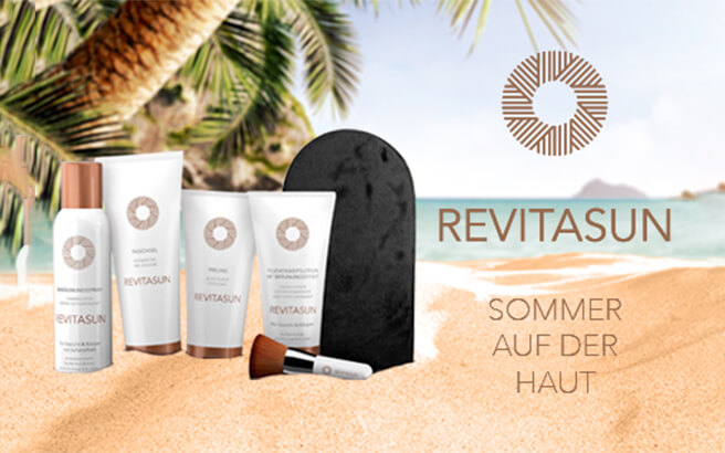 Summerfeeling, das ganze Jahr über mit den Bräunungs- und Pflegeprodukten von REVITASUN. In nur 30 Sekunden verleiht das Bräunungsspray mit den dazu passenden Applikatoren eine natürlich aussehende und ebenmäßige Bräune. Die Pflegeprodukte in der Serie unterstützen den Bräunungsprozess zusätzlich für ein optimales Ergebnis.